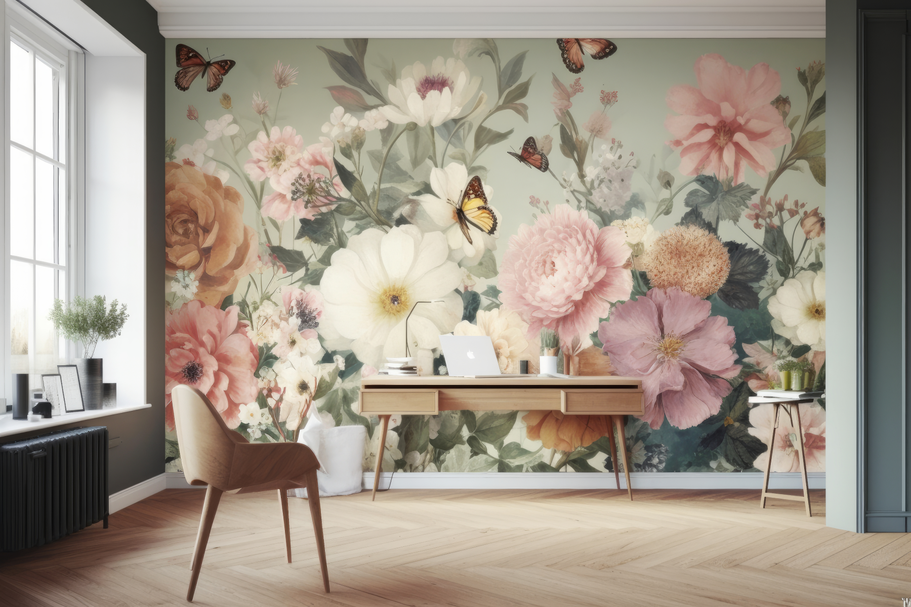 A mural with the visualization of nature is a delicate and beautiful choice. Here, romanticism is combined with nostalgia and a sense of aesthetics. This is a perfect motif for lovers of subtle solutions.